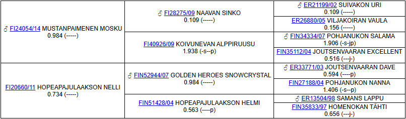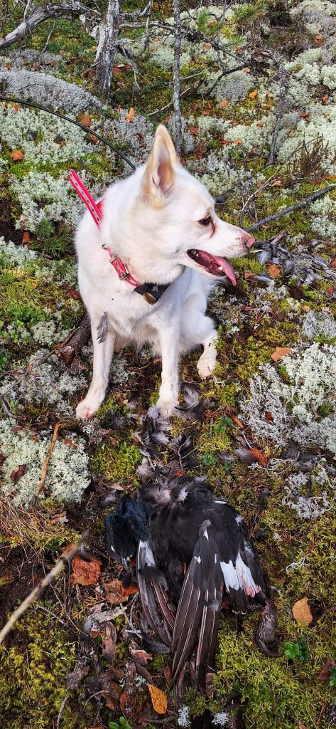 Yhdistelmässä Punapippurin Oikotie Onneen x Korpihongan Erämaan Kulkija tavoitteena on saada monipuolisia, niin näyttöön kuin käyttöön soveltuvia koiria. Skadille urosta valitessa prioriteettina minulla olivat terveys ja rakenne sekä metsästysominaisuuksien monimuotoisuus.